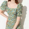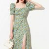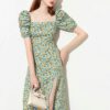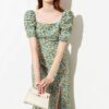 ดเดรสยาวเว้าไหล่ เนื้อผ้าโพลีเอสเตอร์ปั้มนูน รอบปลายแขนยางยืด งานซิปหลัง มีสายผูกด้านหลัง อกไม่มีฟองน้ำ ชุดไม่มีซับใน ผ้าไม่บาง สีเขียวมิ้น