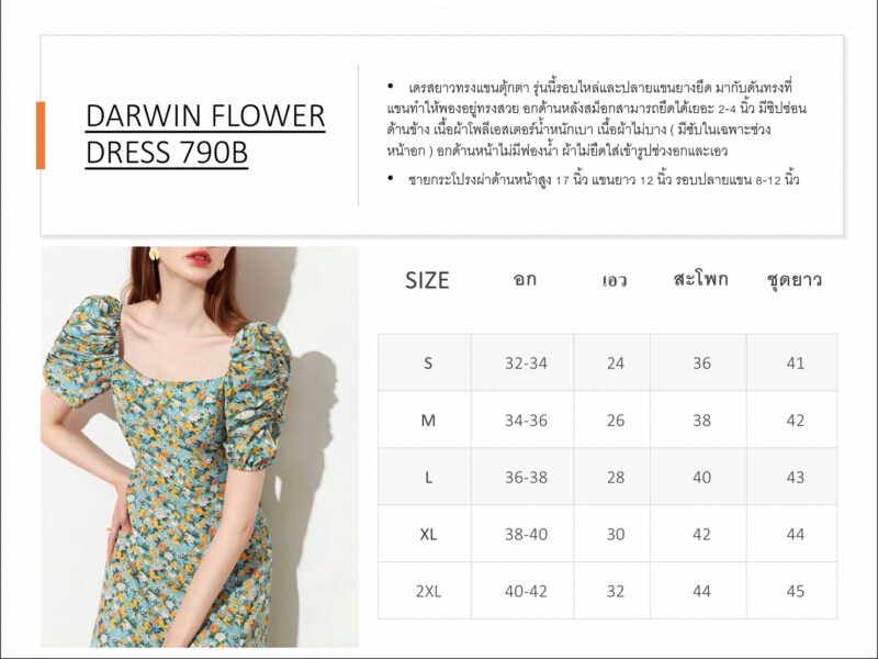 ขนาด Size : อก/ใต้อก/เอว/สพ/ชุดยาว แขนยาว/รอบแขน S: 32/28/26138/44/11/8-16 M: 34/30/28/40/45/11/8-16 L: 36/32/30/42/46/12/9-18