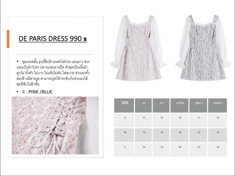 ชุดเดรสสั้นรุ่นนี้ ซิปด้านหลังใส่ง่าย แขนยาว ช่วงแขนเป็นผ้าโปร่ง ปลายแขนยางยืด ตัวชุดเป็นเนื้อผ้าลูกไม้ทั้งตัว ไม่บาง ไม่แข็ง ไม่คัน ใส่สบาย ช่วงเอวทั้งสองข้างมีสายรูด สามารถรูดให้กระชับช่วงเอวได้ ชุดมีซับในอีกชั้น สี : PINK/BLUE