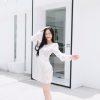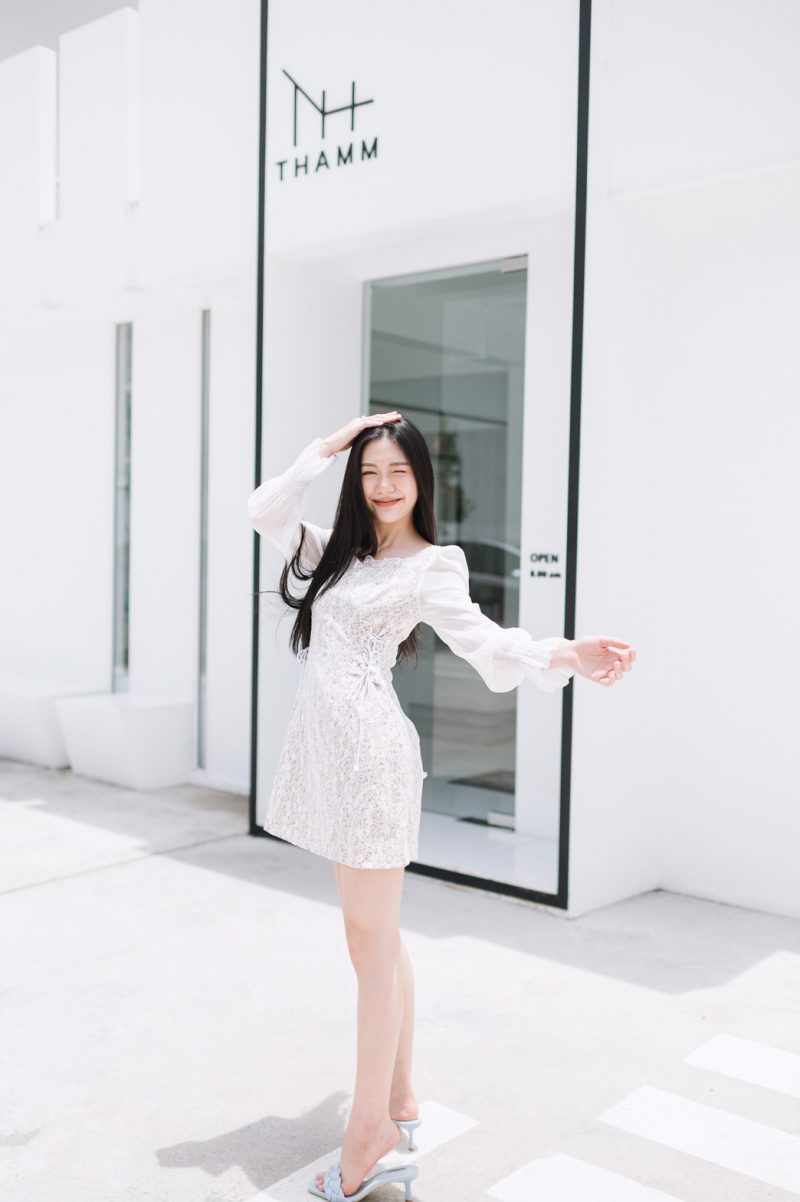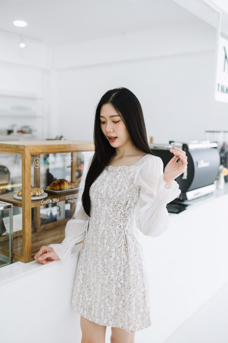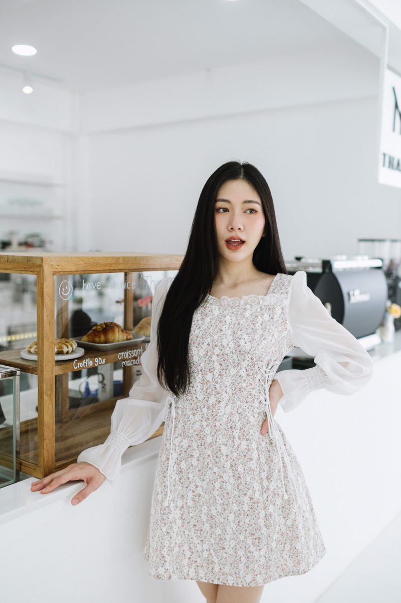 ชุดเดรสสั้นรุ่นนี้ ซิปด้านหลังใส่ง่าย แขนยาว ช่วงแขนเป็นผ้าโปร่ง ปลายแขนยางยืด ตัวชุดเป็นเนื้อผ้าลูกไม้ทั้งตัว ไม่บาง ไม่แข็ง ไม่คัน ใส่สบาย ช่วงเอวทั้งสองข้างมีสายรูด สามารถรูดให้กระชับช่วงเอวได้ ชุดมีซับในอีกชั้น