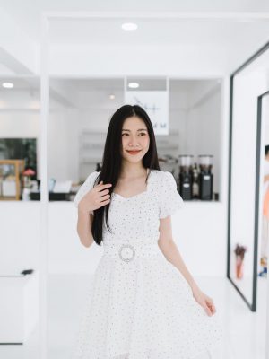 ชุดเดรสสั้นสำหรับออกงาน เนื้อผ้าลูกไม้ถักทอทั้งชุด แต่งกลิตเตอร์ทั้งชุด รอบคอ/รอบเอว เนื้อผ้ามีน้ำหนัก ไม่ยืด อยู่ทรงใส่แบบเข้ารูปซิปด้านหลังใส่ง่าย แขนทรงบอลลูนผ ผ้าลูกไม้แบบโปร่ง รอบปลายแขนไม่ยืด