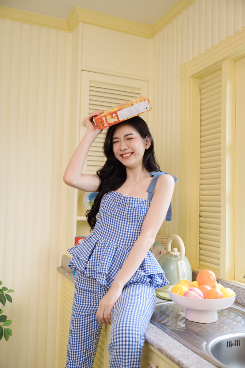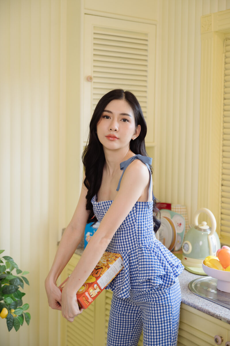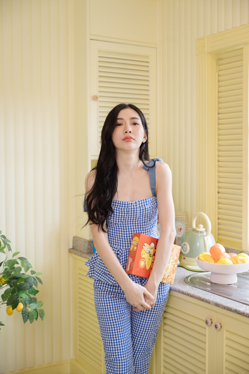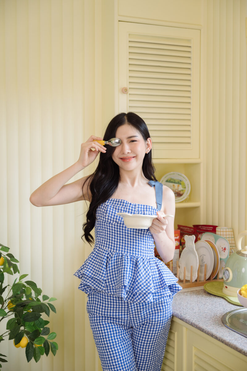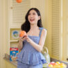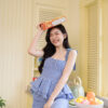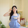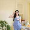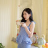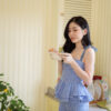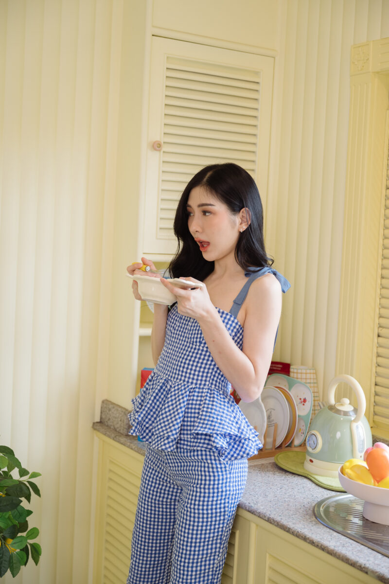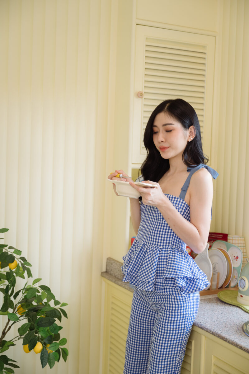 เสื้ออแขนกุด และกางเกงเอวสูง เนื้อผ้าโพลีเอสเตอร์หนา มีน้ำหนัก เนื้อผ้ายืดหยุ่นได้อีก 1-2 นิ้ว