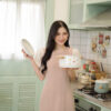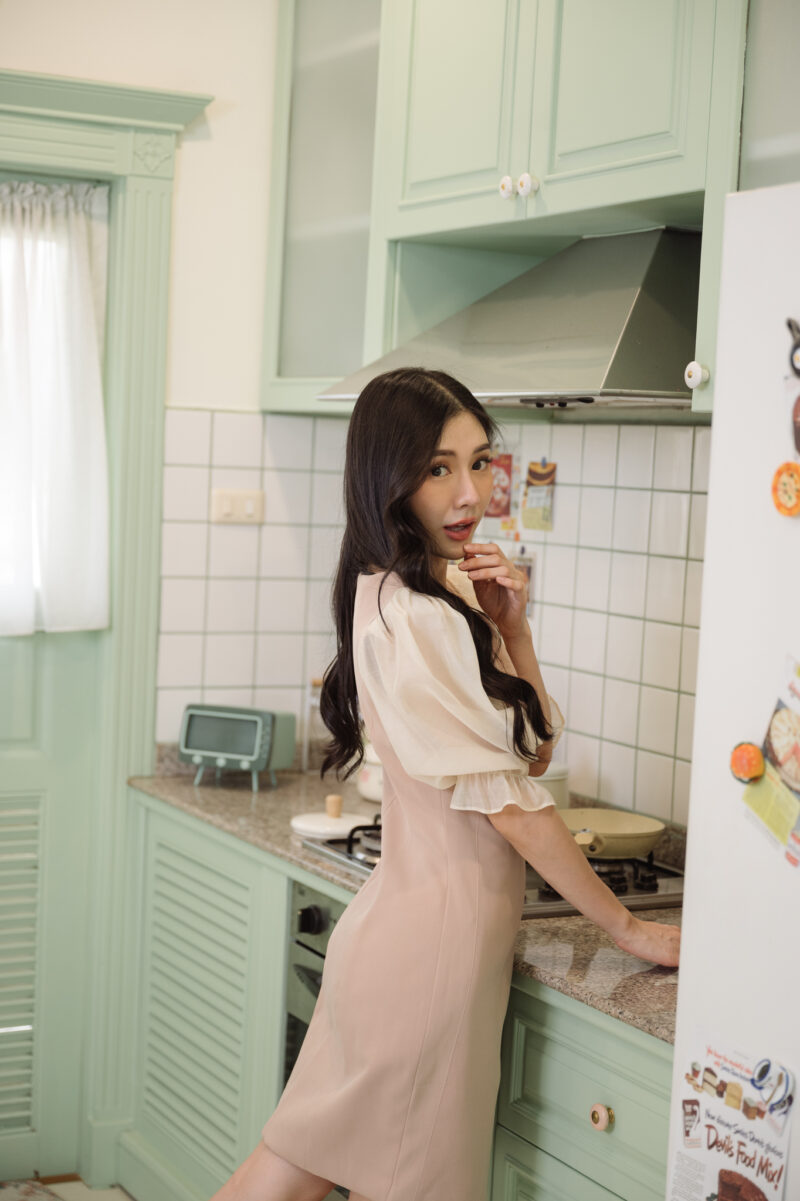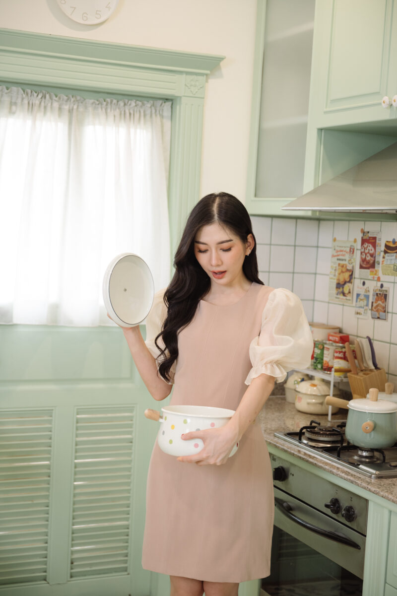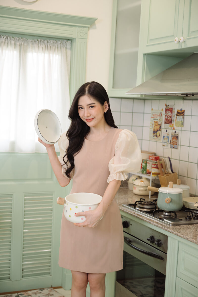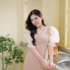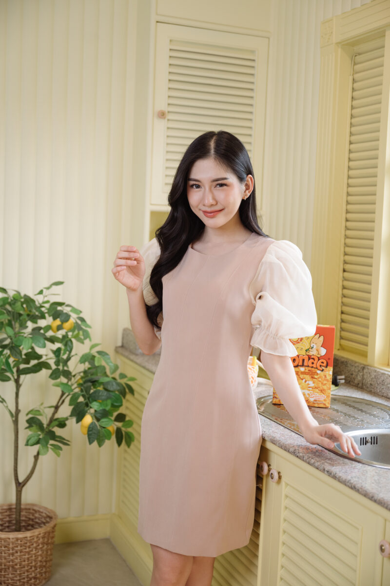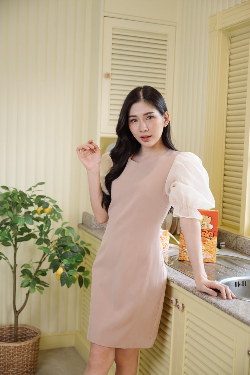 ชุดเดรสสั้น ช่วงแขนผ้าไหมแก้วแบบโปร่ง ปลายแขนยางยืด ตัวชุดผ้าโพลีเอสเตอร์แบบหนา ผ้าไม่ยืด ใส่แบบเข้ารูป ผ้าหนาอยู่ทรง ชุดมีซับใน ซิปด้านหลังใส่ง่าย อกไม่มีฟองน้ำ แขนชุดยาว 16-17 นิ้ว สีน้ำตาลเบจ