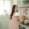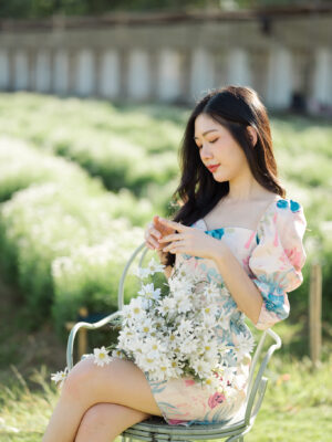 ท่อนกระโปรงแต่งระบายเป็นชั้นๆ เอวชุดแบบยางยืด ยืดได้เยอะ มีกระดุม