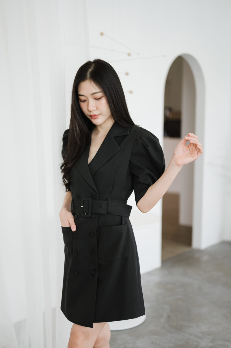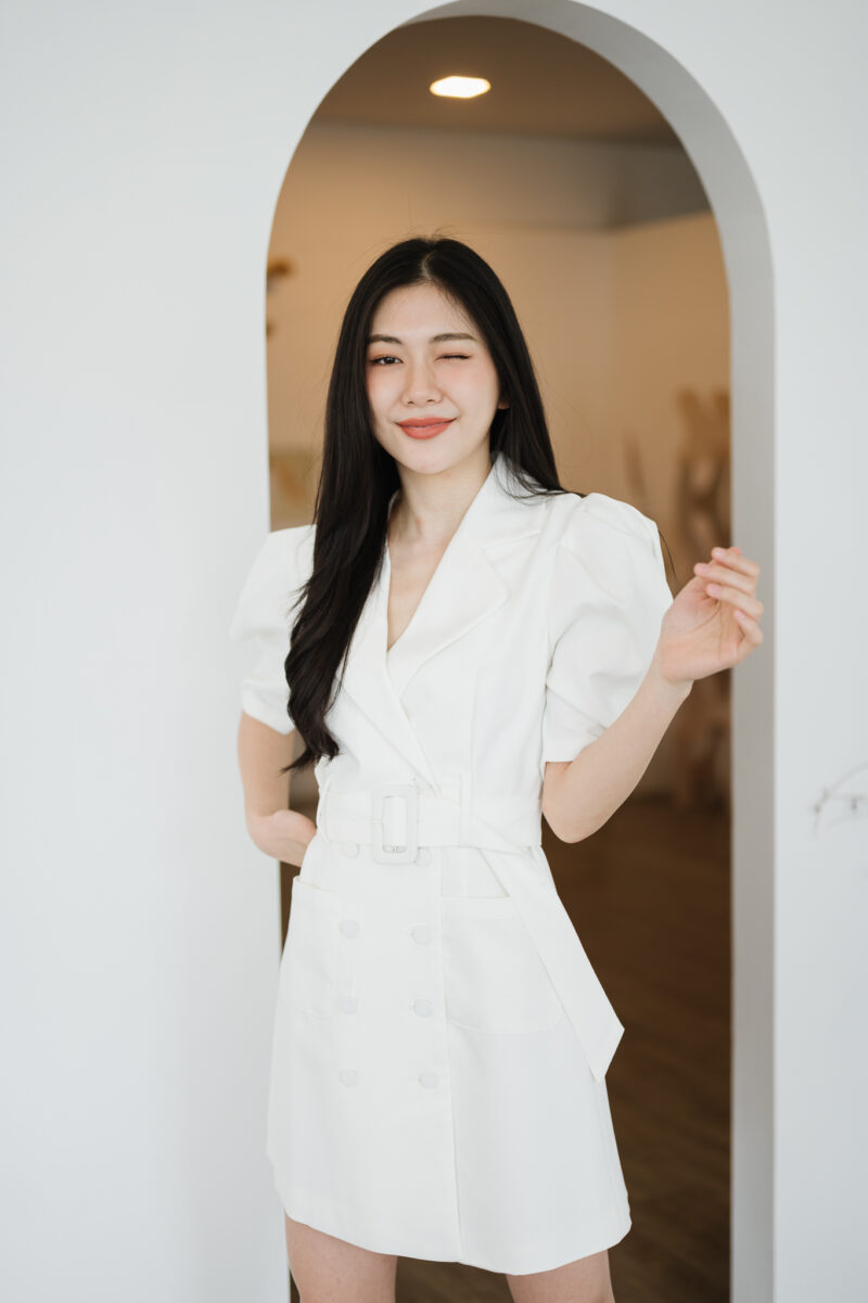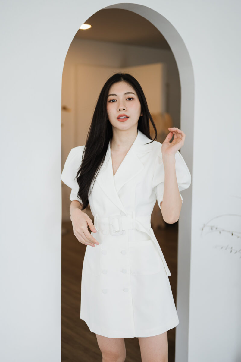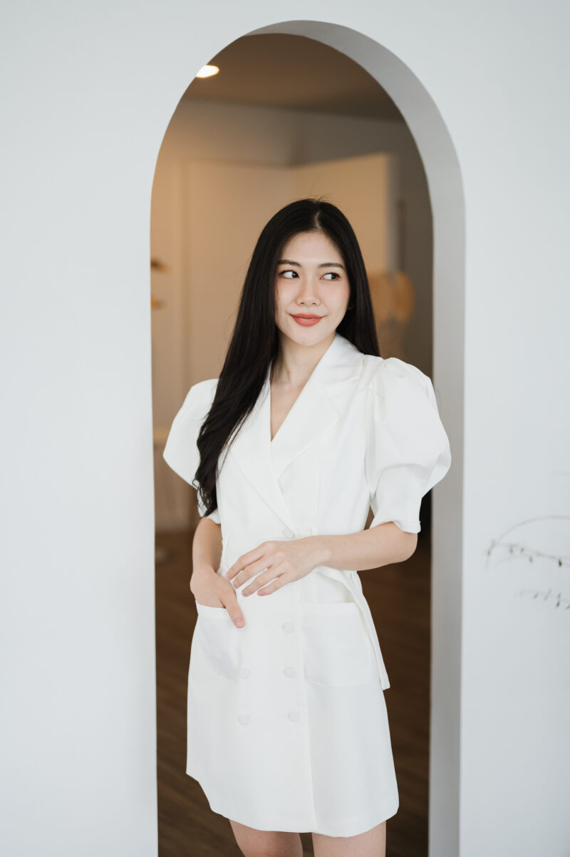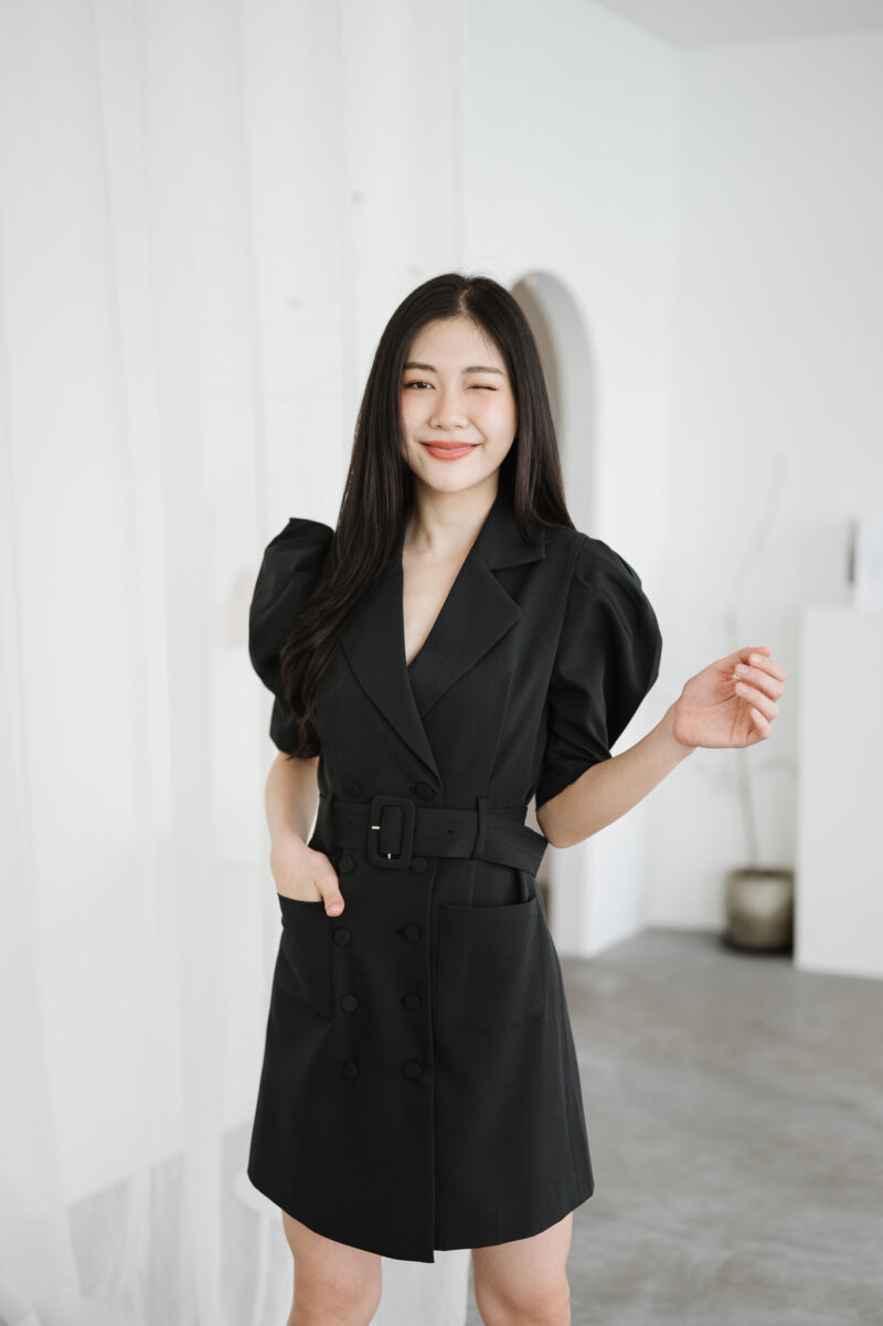 เดรสสั้นทรงสูทคอปก กระดุมหน้าทั้งชุด แขนทรงตุ๊กตา เนื้อผ้าคอดตอนแบบ