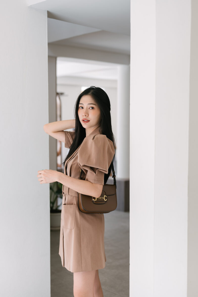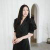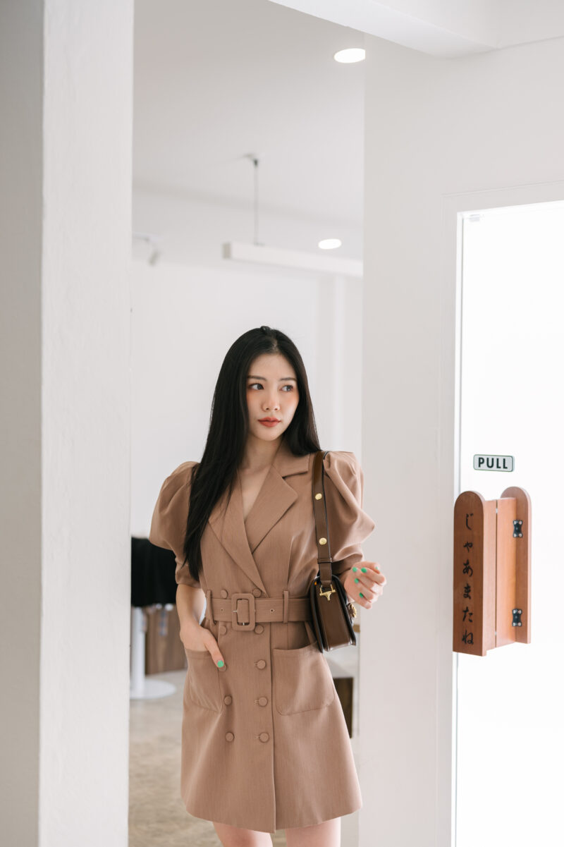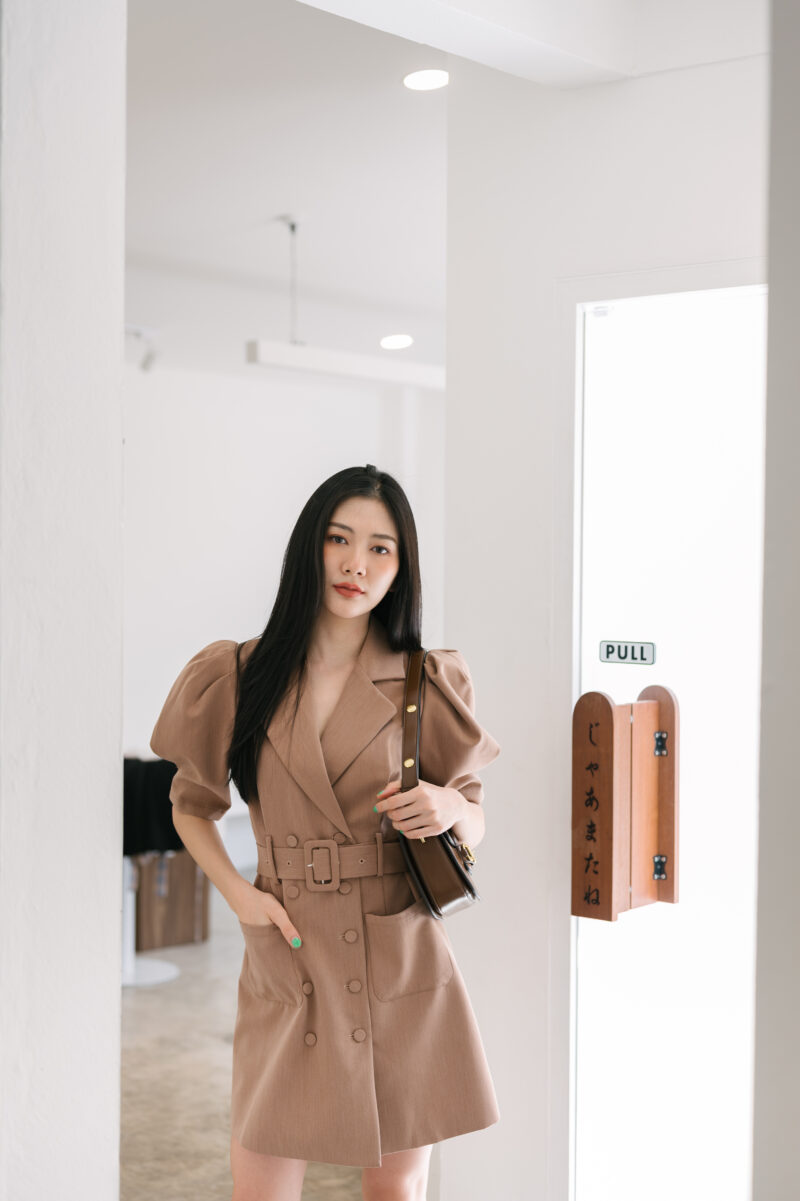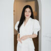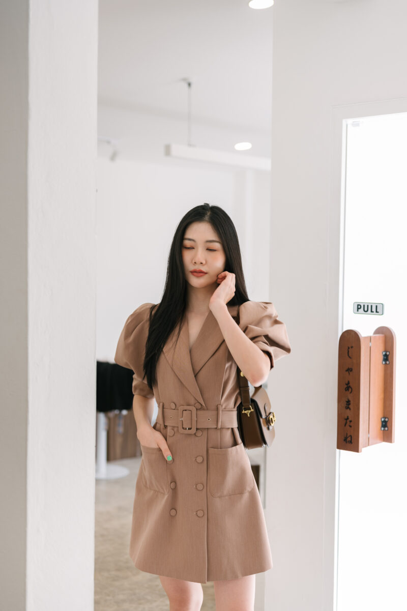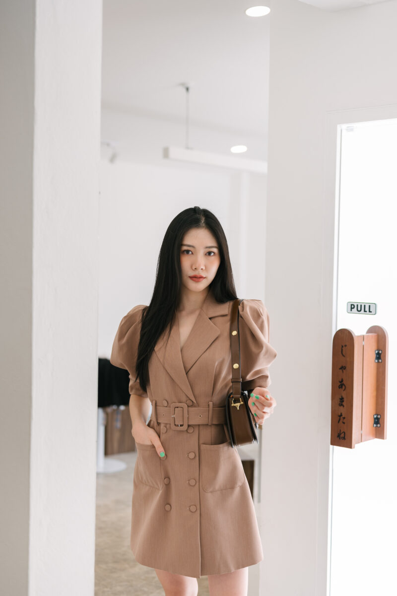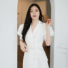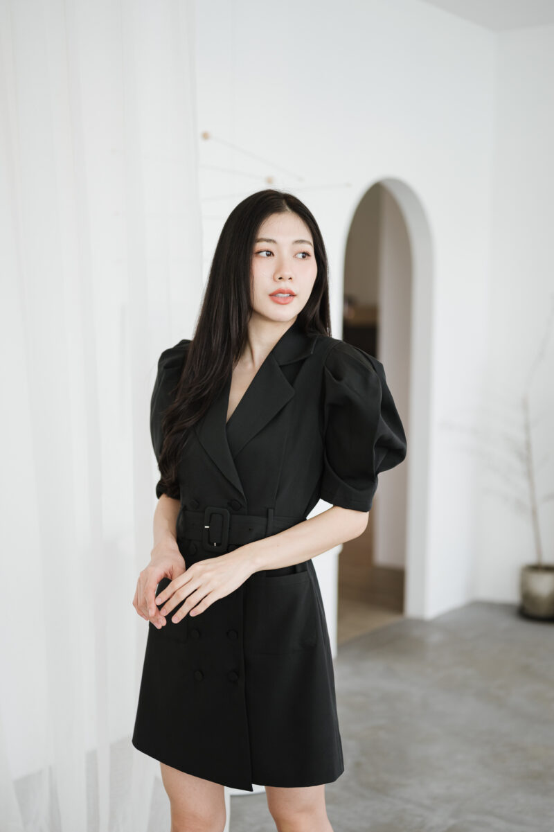 เดรสสั้นทรงสูทคอปก กระดุมหน้าทั้งชุด แขนทรงตุ๊กตา เนื้อผ้าคอดตอนแบบ