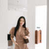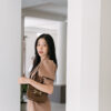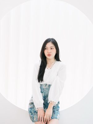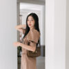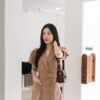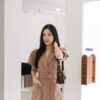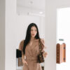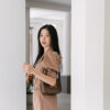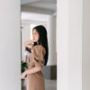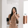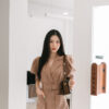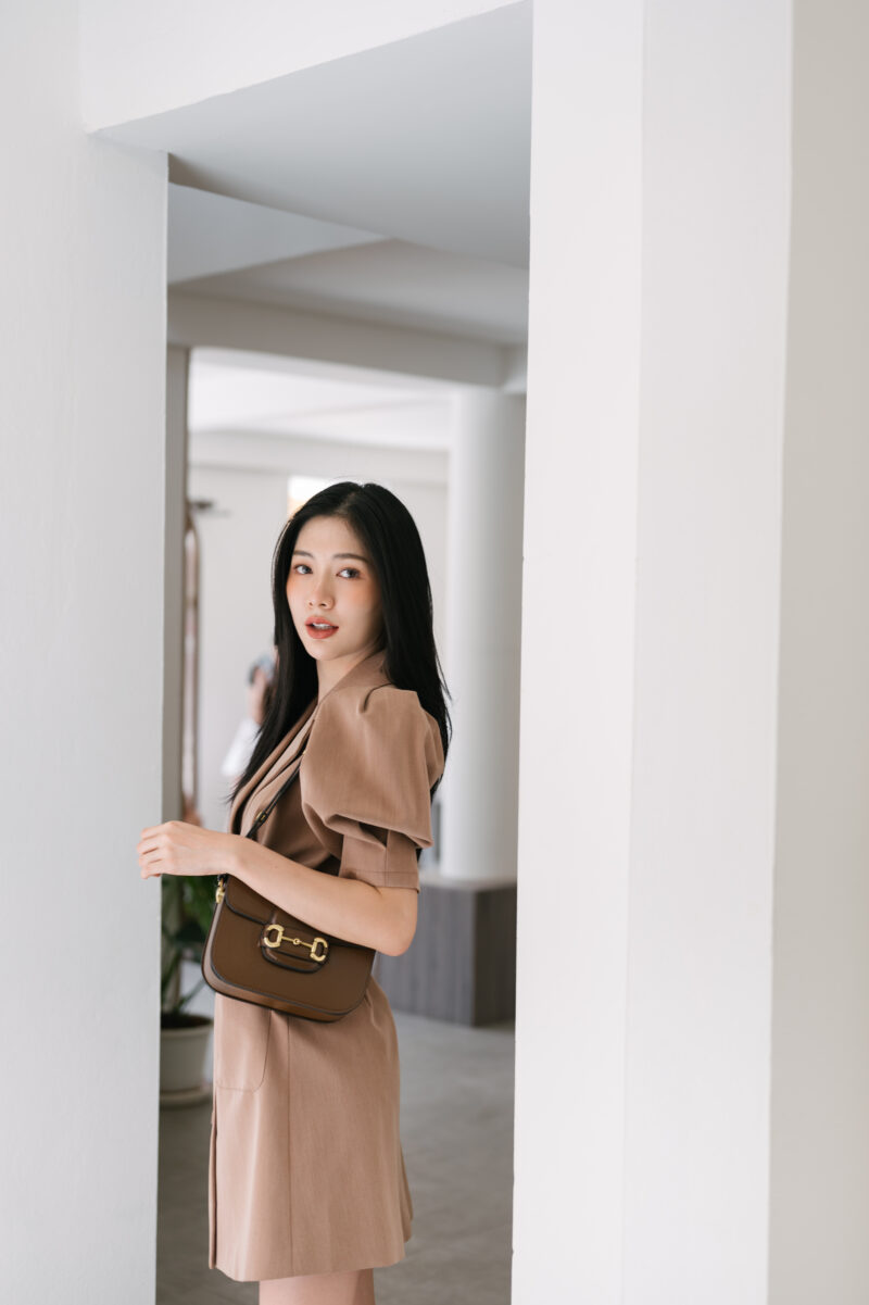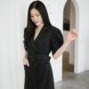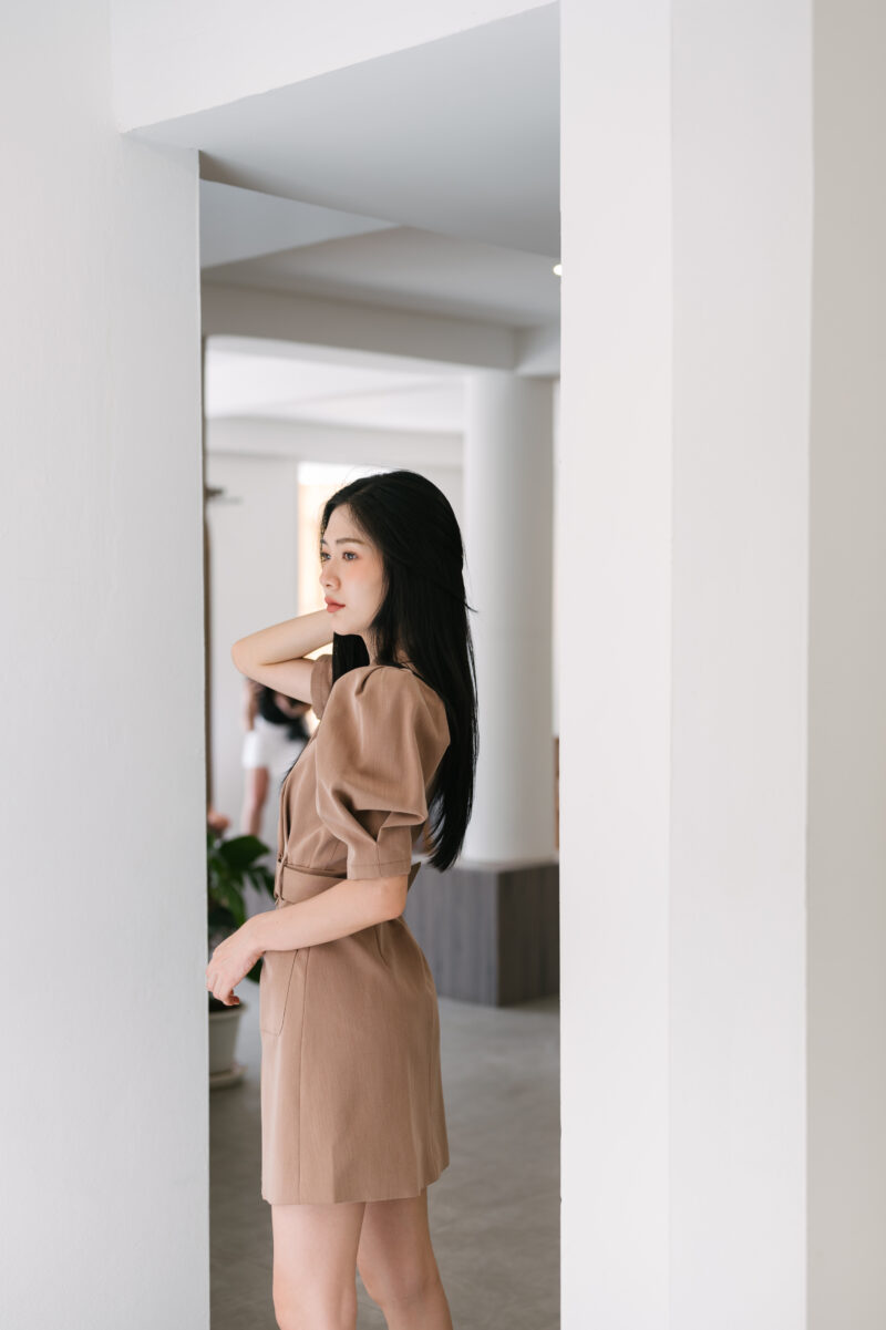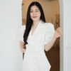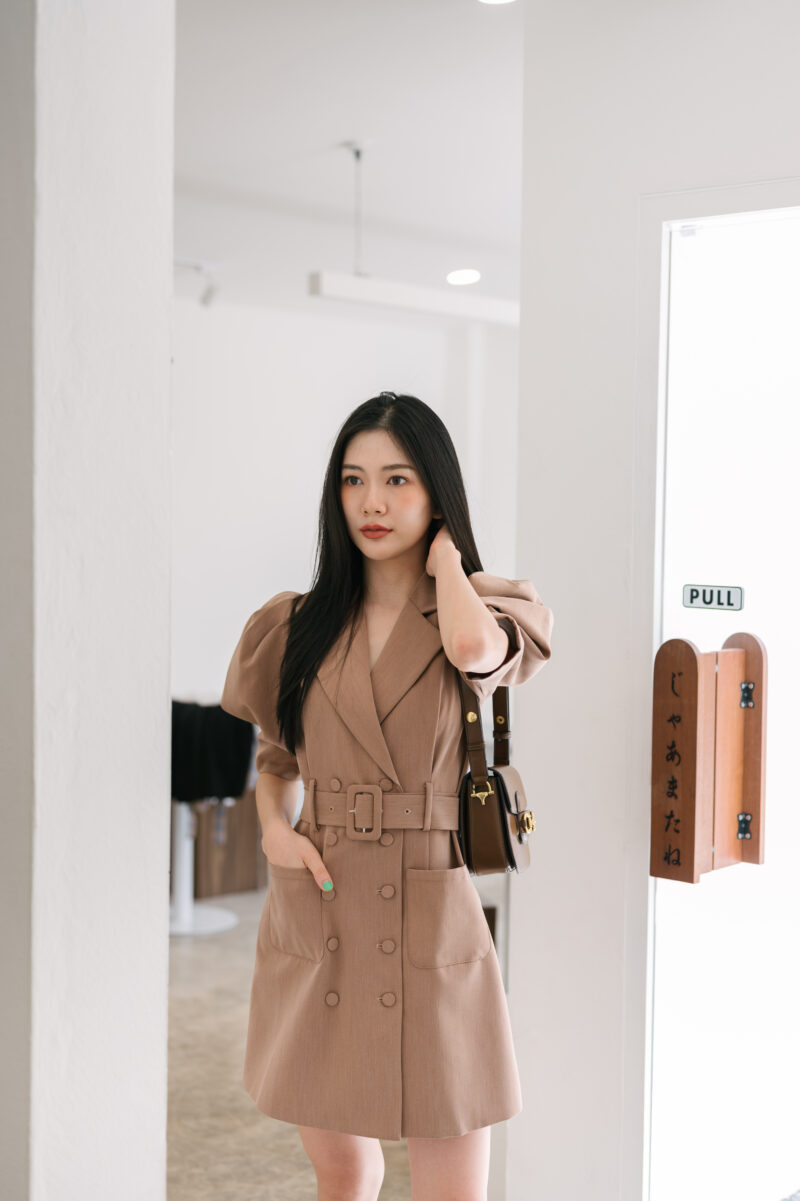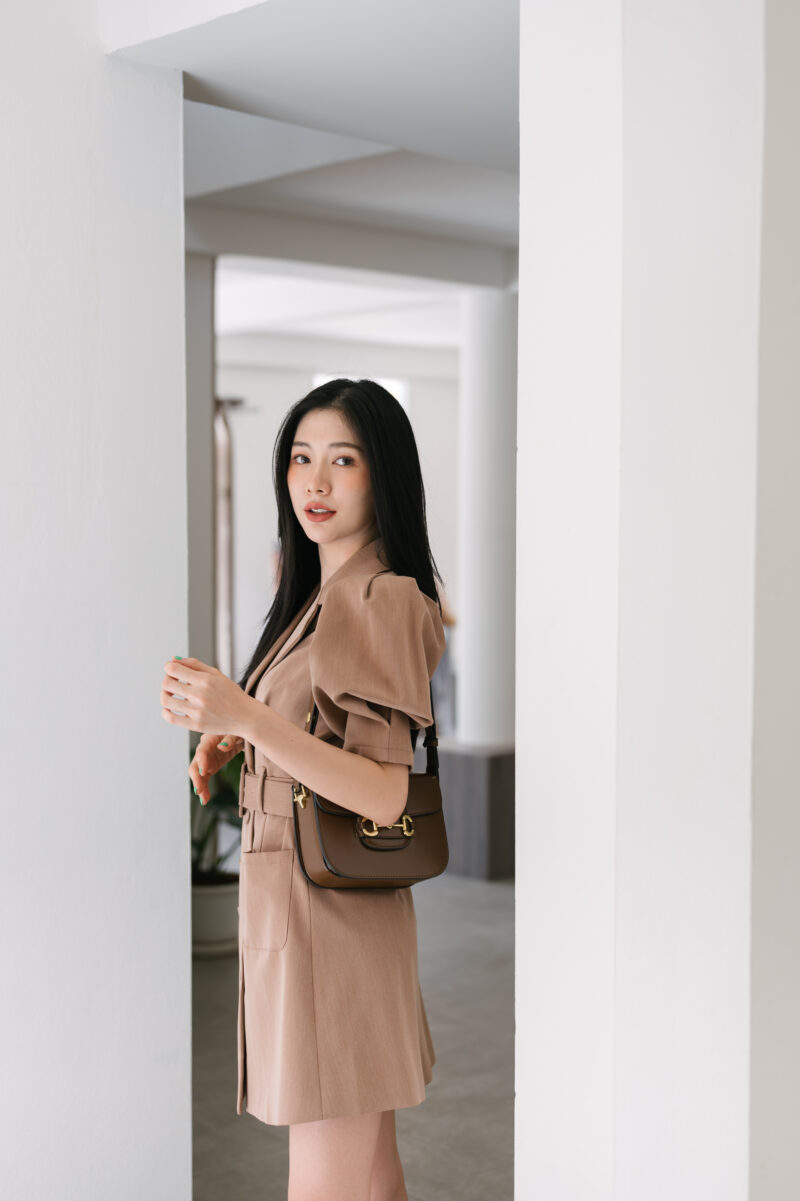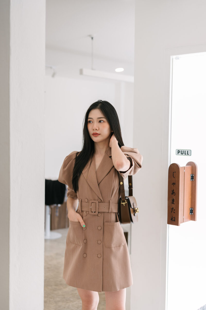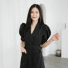 เดรสสั้นทรงสูทคอปก กระดุมหน้าทั้งชุด แขนทรงตุ๊กตา เนื้อผ้าคอดตอนแบบ